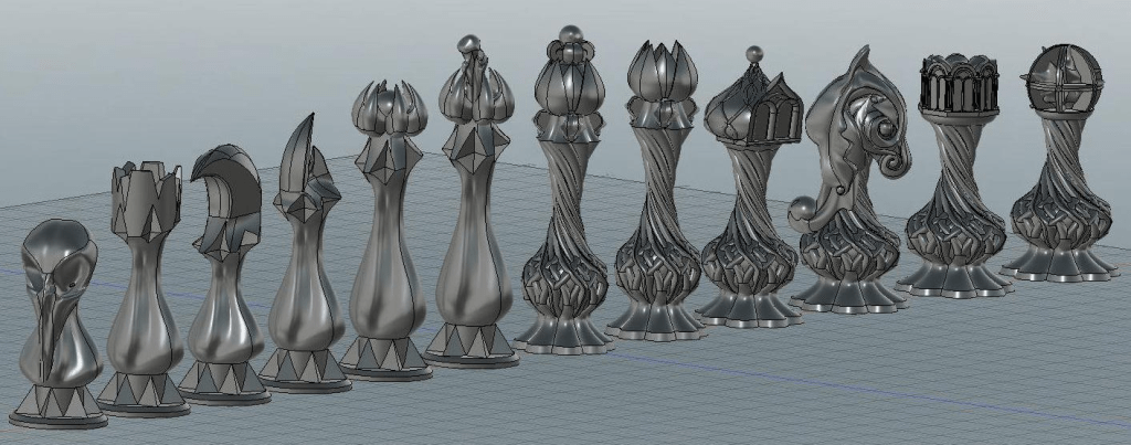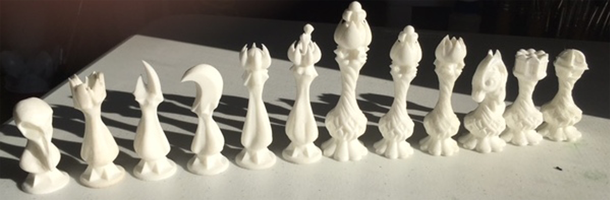 The set was sketched, modeled in Fusion360, printed in nylon using an SLS process, molds were created in silicone, and those were used to cast the pieces in a two part urethane resin mixed with natural fillers.